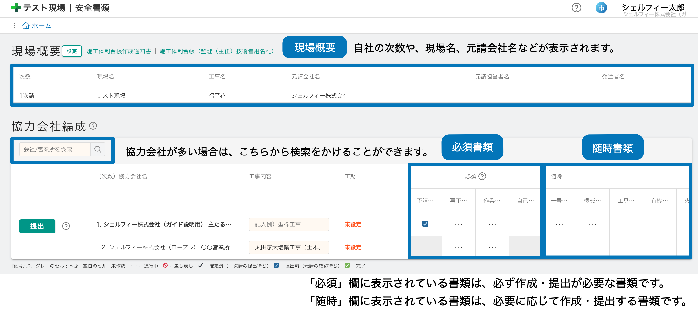 協力会社編成に表示されてるマークから、各書類の進捗状況を確認できます。