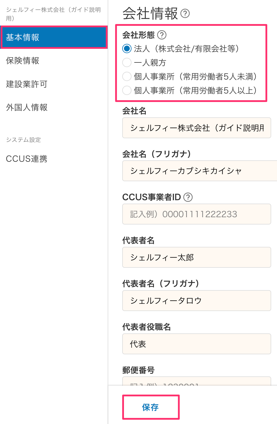 誤りがある場合は正しい会社形態を選択し、[保存]をクリックします。