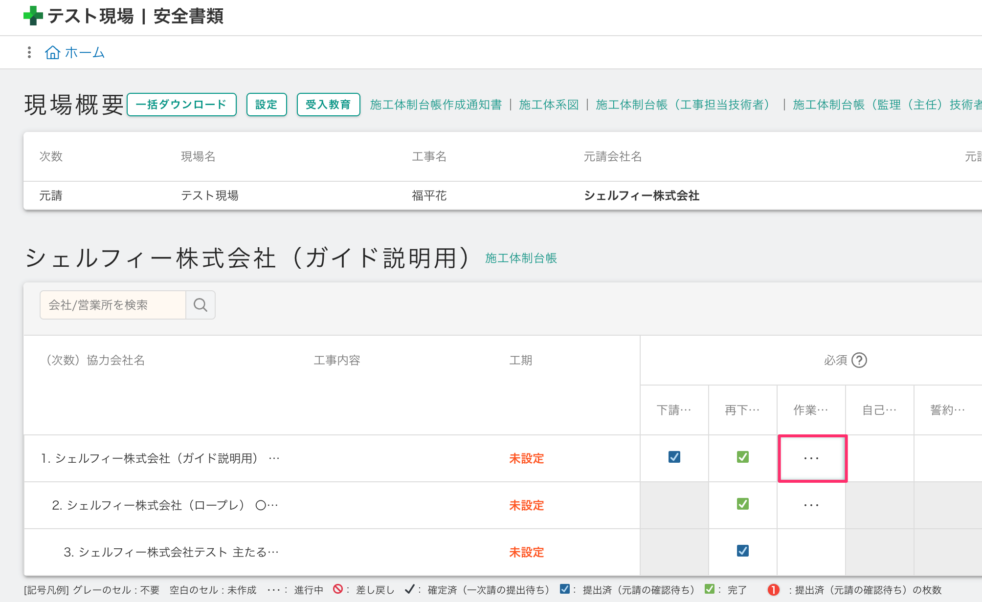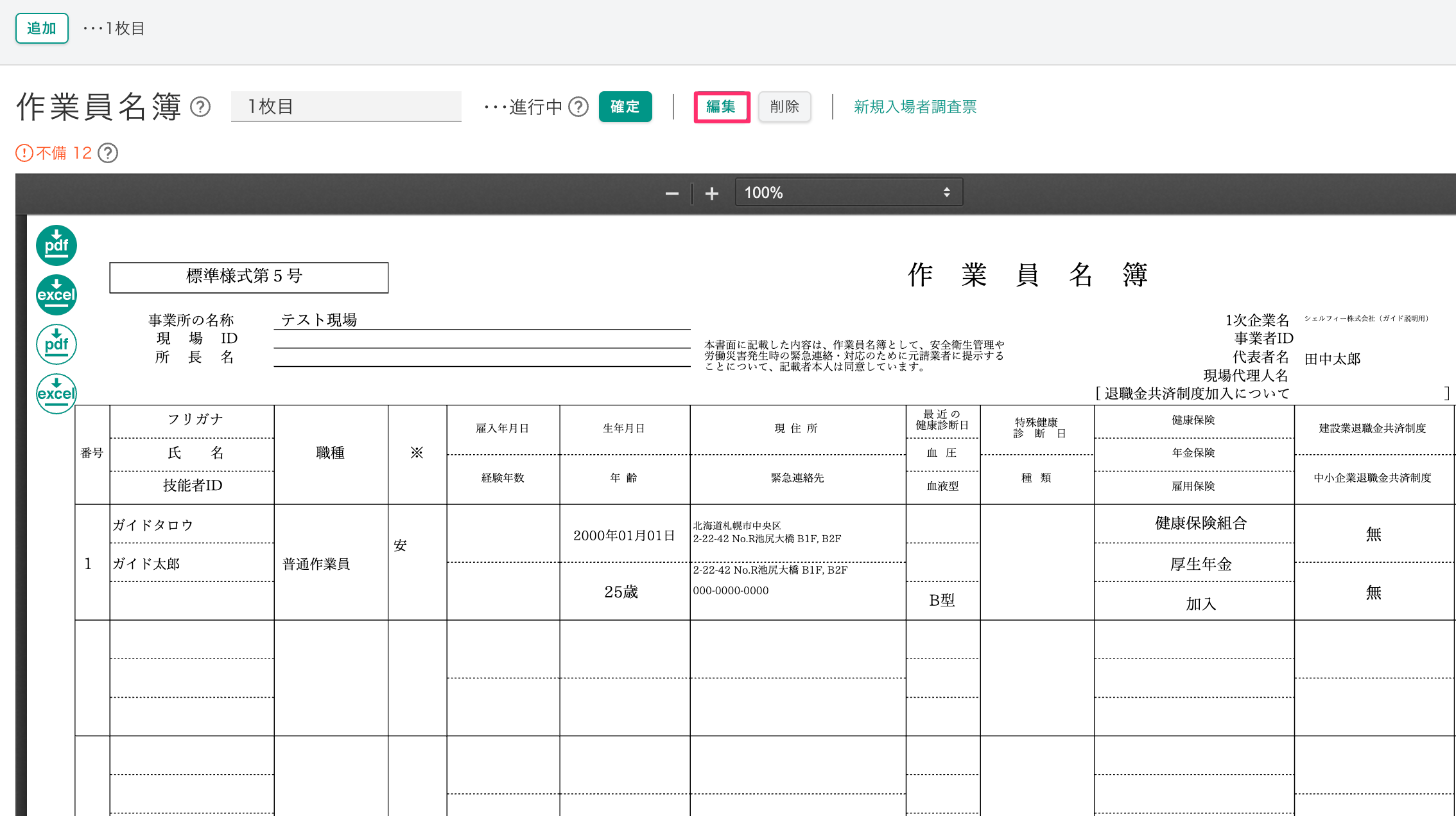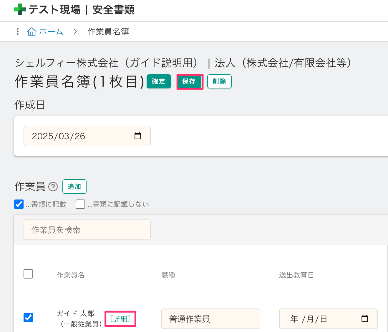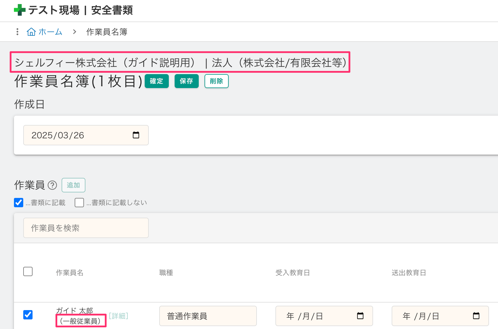 作業員名簿でも会社形態と雇用形態の確認ができます。