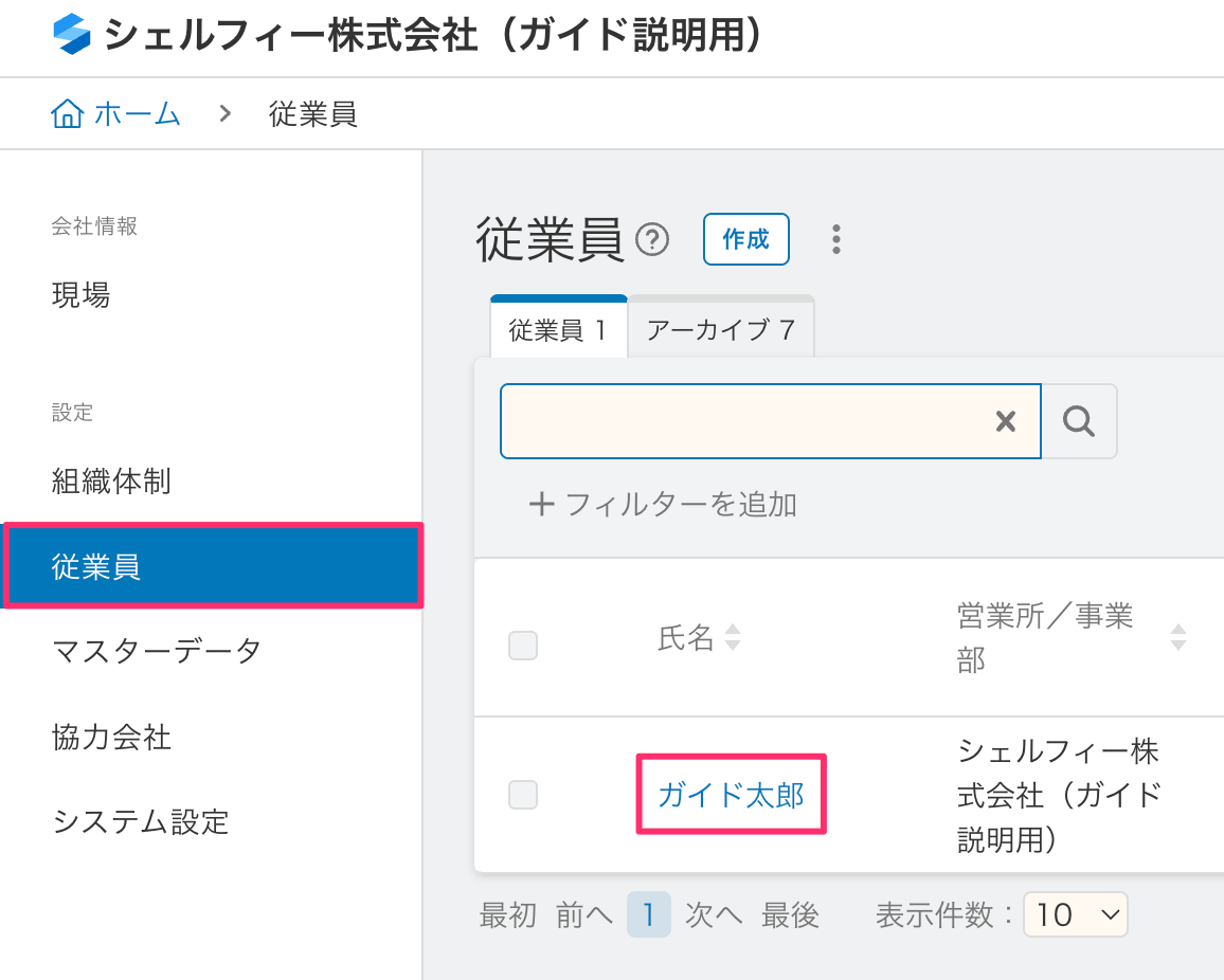 [従業員]から不備が表示されている{従業員名}をクリックします。