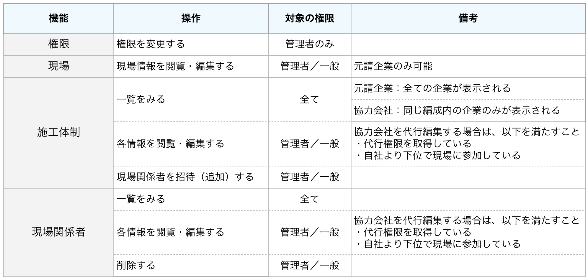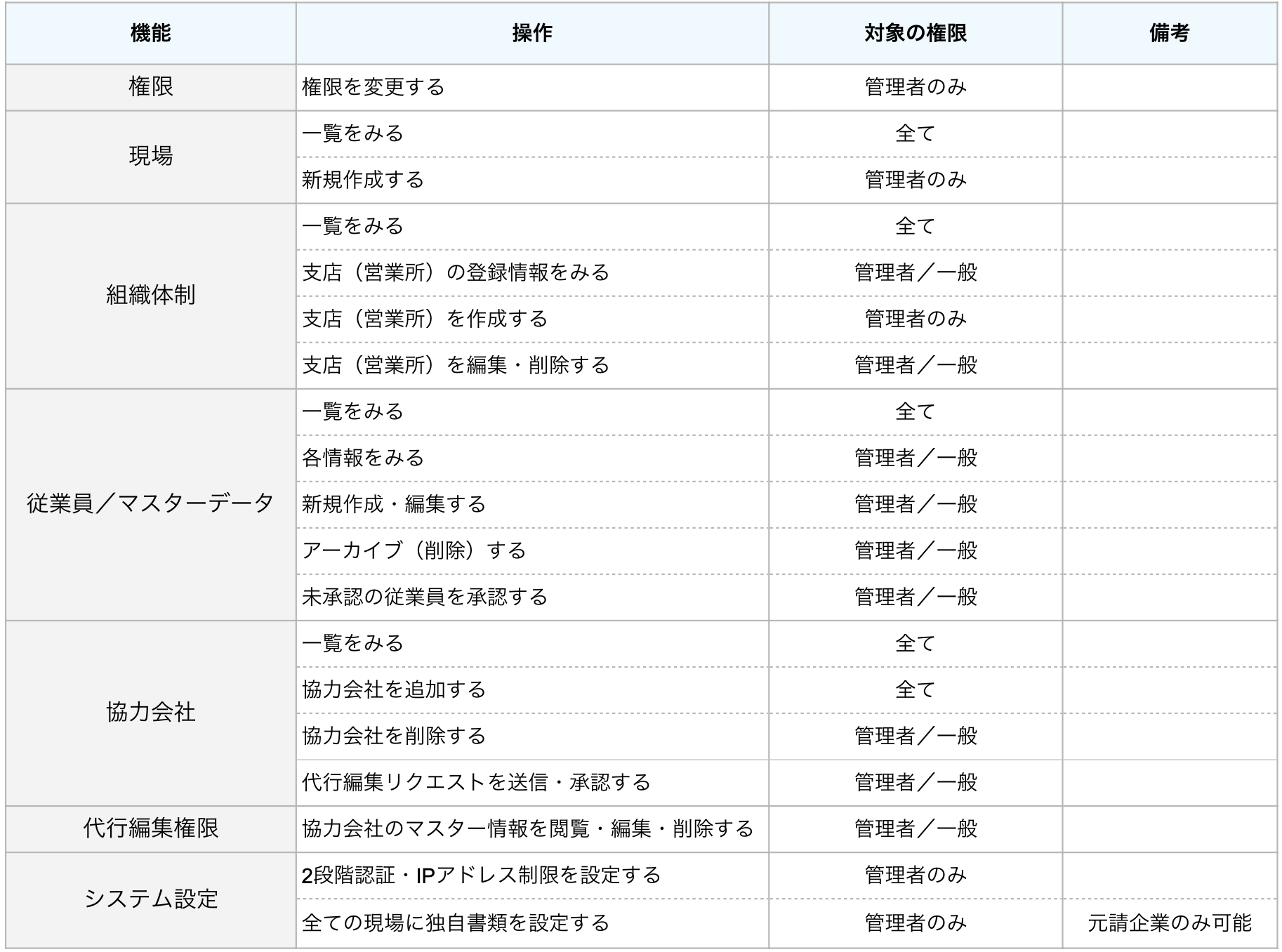 元請企業として利用している会社様の場合は、料金発生に関わる操作がありますので、推奨権限設定については運用サポート担当へ相談してください。