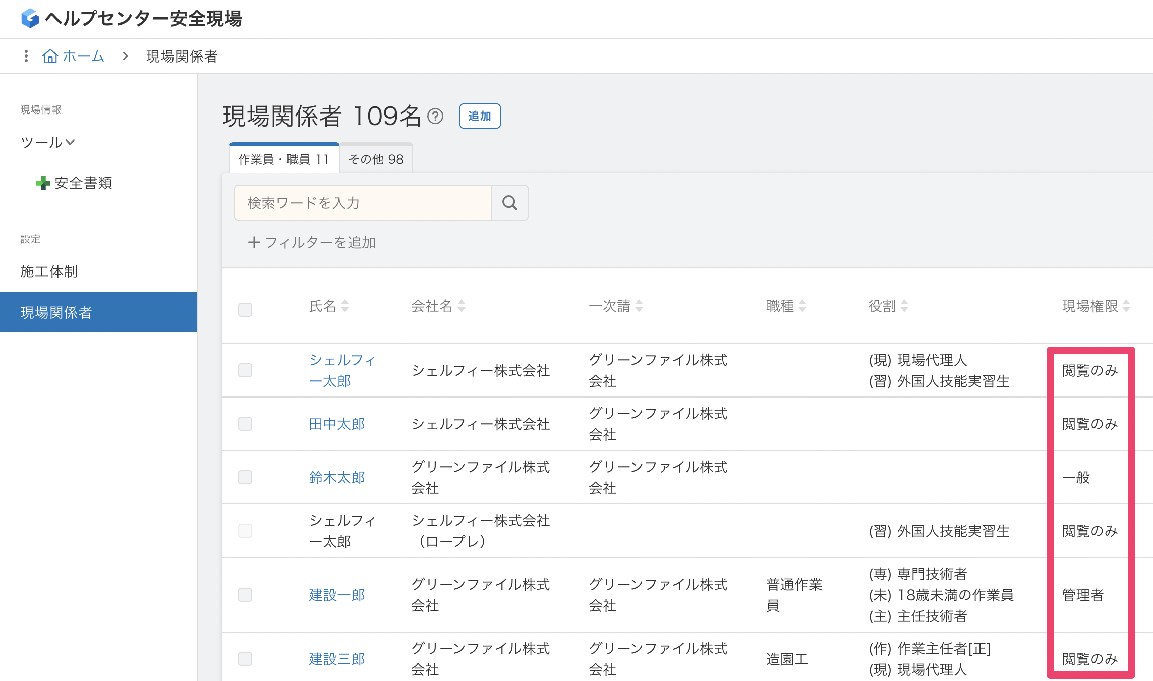 協力会社として利用している会社様の中で、Greenfile.workを操作される従業員様は、すべての操作が可能な[管理者]での設定を推奨しています。