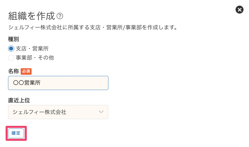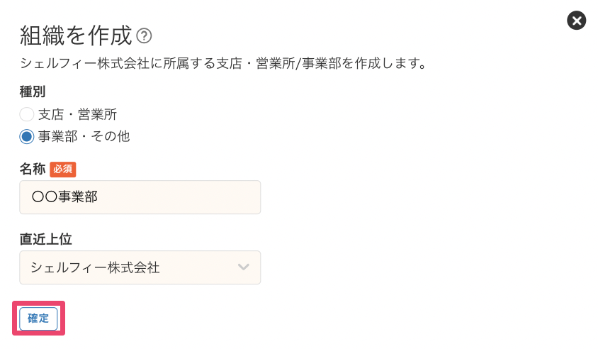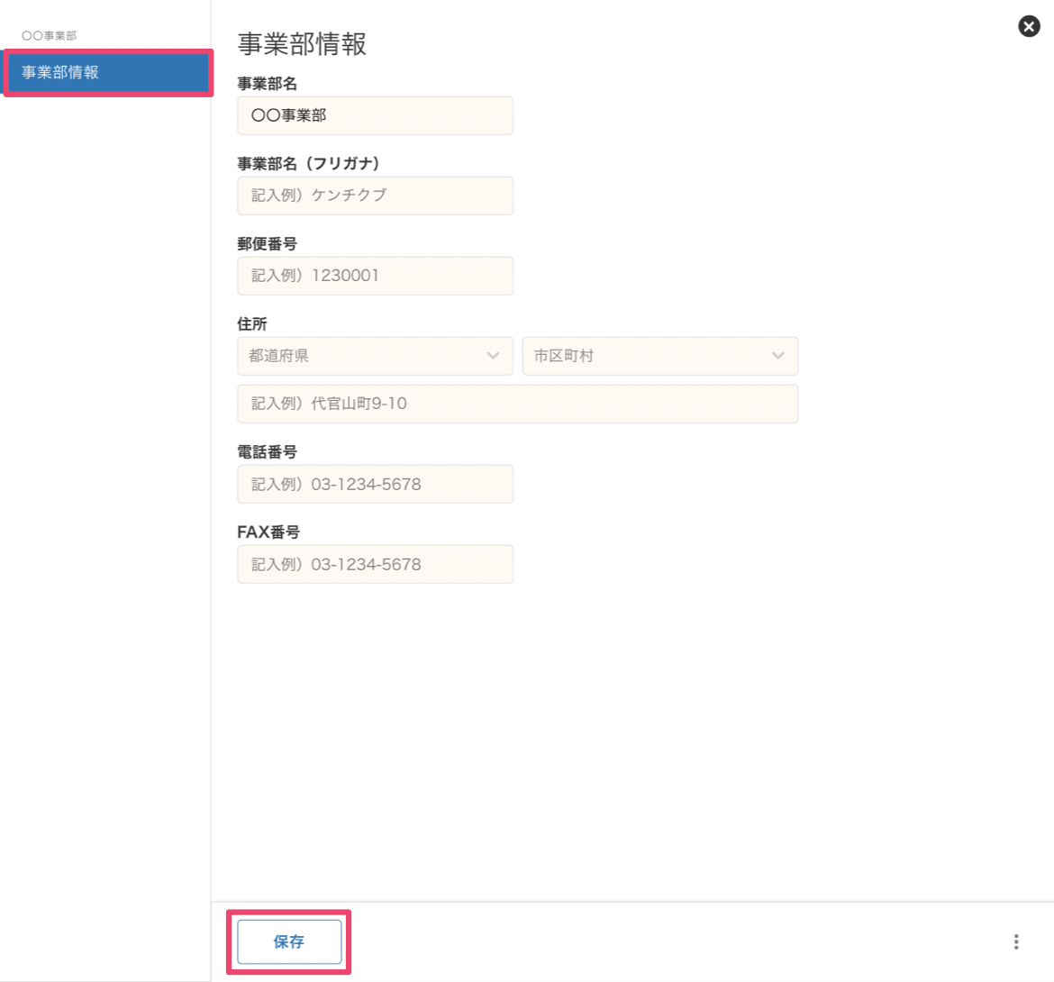 必要な情報を入力し[保存]をクリックすると、事業部が追加されます。