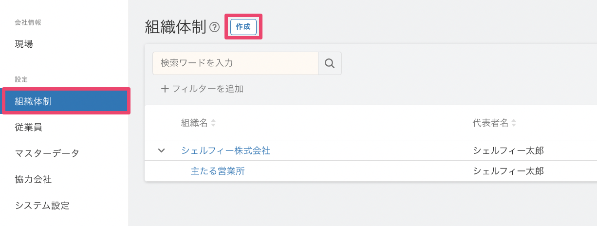 主たる営業所の下に土木事業部を作成したい場合は[直近上位]で{主たる営業所}を選択します。