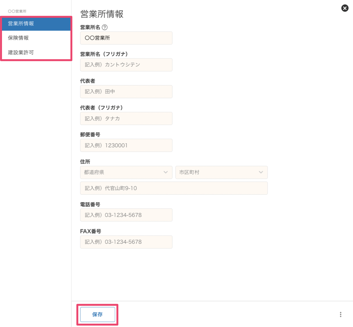 [営業所情報][保険情報][建設業許可]をクリックして切り替えると、各情報を入力できます。