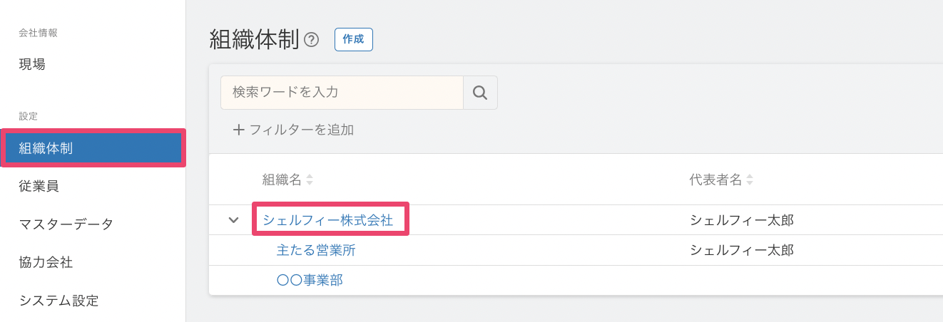 [組織体制]から{会社名} をクリックします。