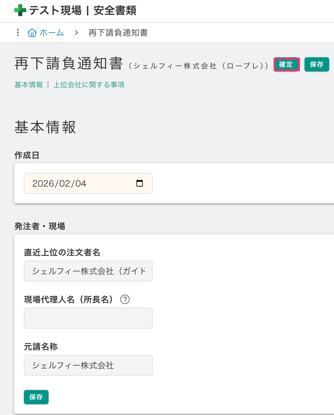 書類作成画面から安全書類に不備がないか確認したうえで、[確定]をクリックします。