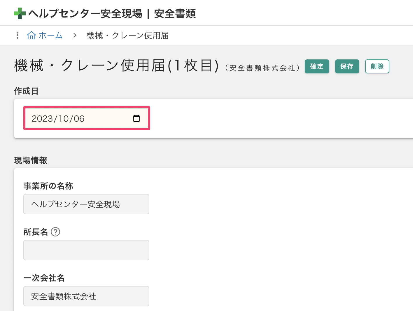 [作成日]を入力し、[機械]は事前に登録した車両から該当のものを選択します。