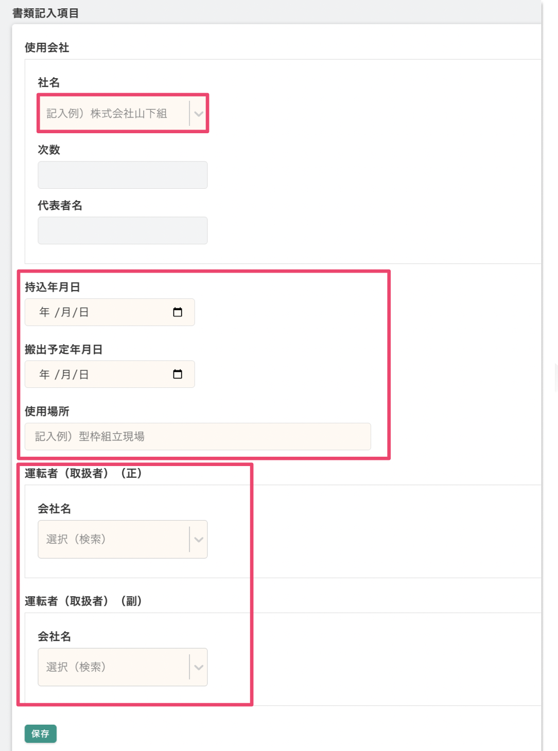 [社名][持込年月日][搬出予定年月日][使用場所]を入力後、[運転者氏名][資格の種類]を選択します。