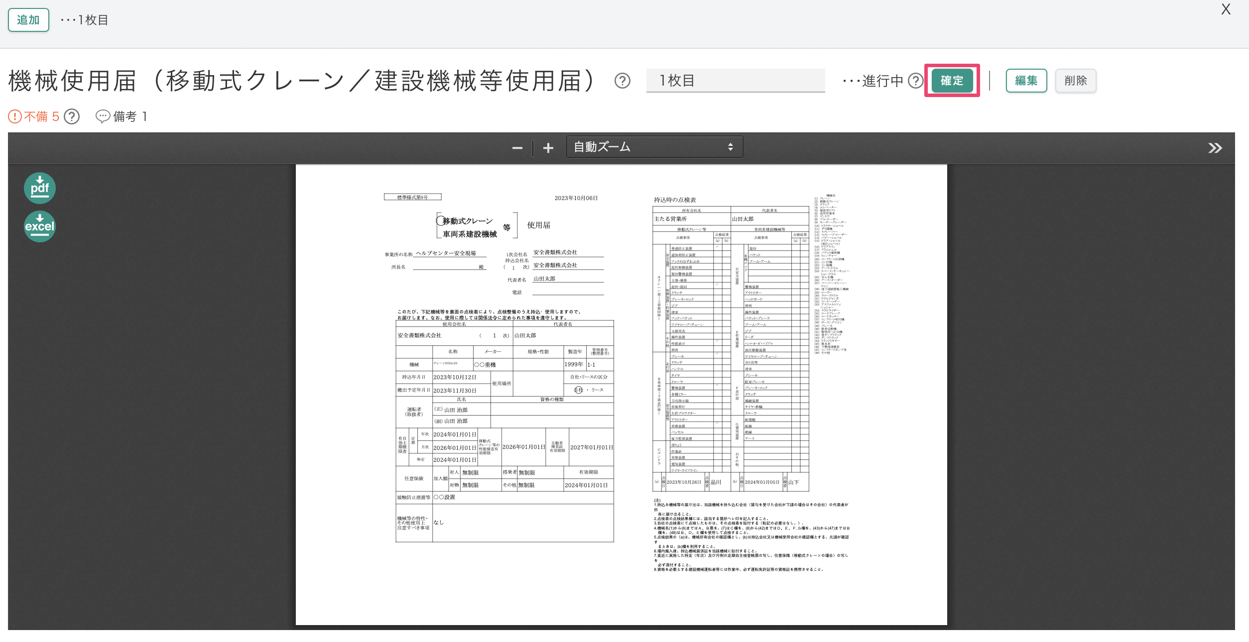 登録方法は機械・クレーン情報を登録するを参照してください。