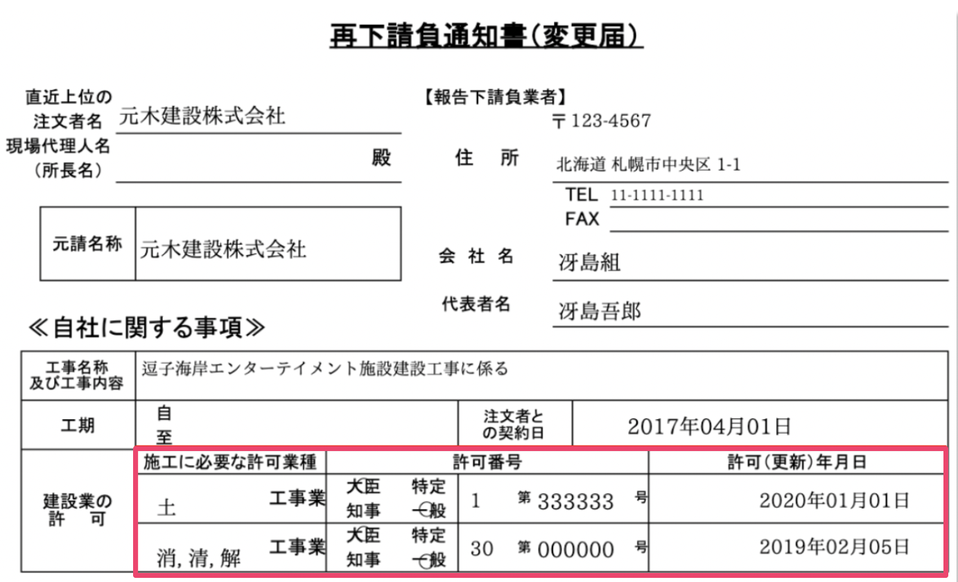 Q.全ての建設業許可が書類に反映されないのはなぜ? 2025年03月09日 23:00 更新 A.建設業許可が複数あり安全書類に反映されない場合は、書類プレビューを下にスクロールすると表示されます。 下にスクロールするには、画像の右端の棒をクリックしたまま下に移動するか、マウスで下にスクロールしてください。以下のように、建設業許可のみ異なる2枚目の再下請負通知書が表示されます。