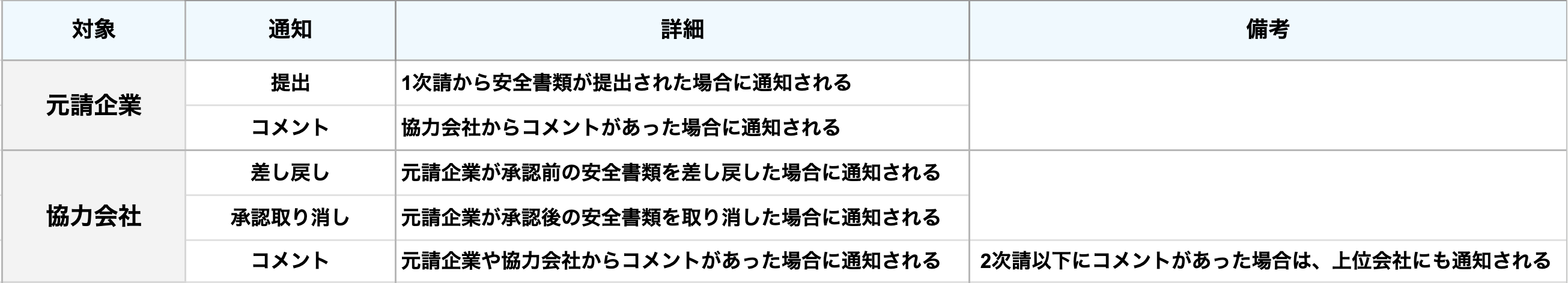 初期設定で[安全書類通知に関する通知]がチェックが入っているのは、最初に現場に参加した時点で現場権限が[管理者]となっている従業員のみです。