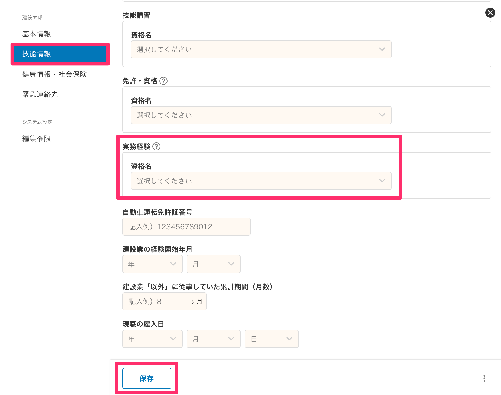 2.[技能情報]>[実務経験]>該当の実務経験を検索>[保存]