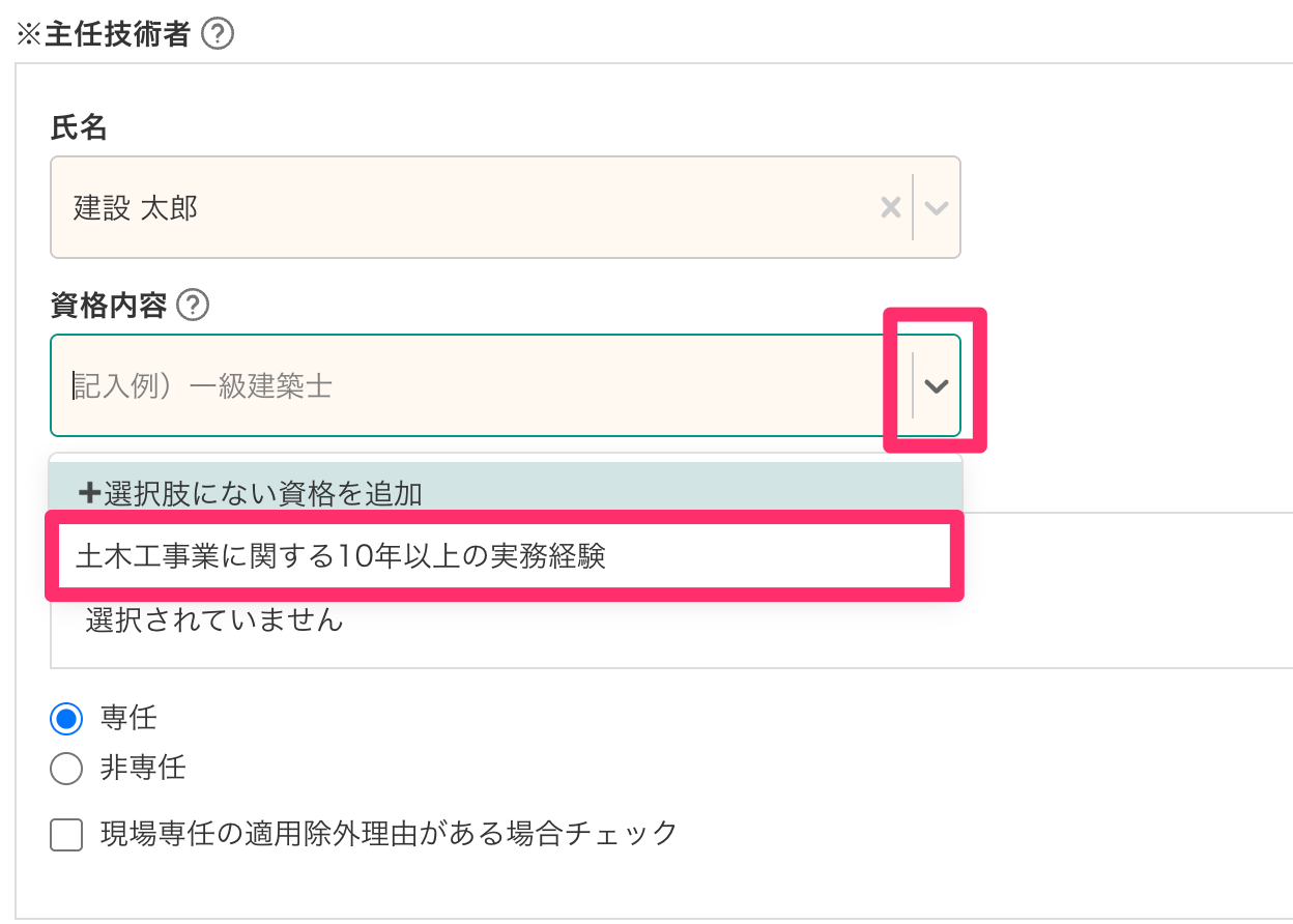 [主任技術者]より、該当する従業員を入力後、[資格内容]より登録した実務経験をクリックします。