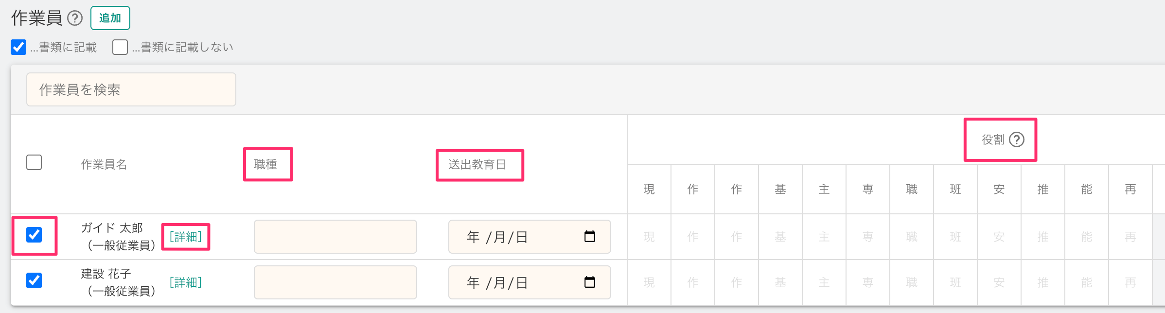 以下の画面では、作業員名簿に追加したい従業員にチェックを付けて書類を作成できます。