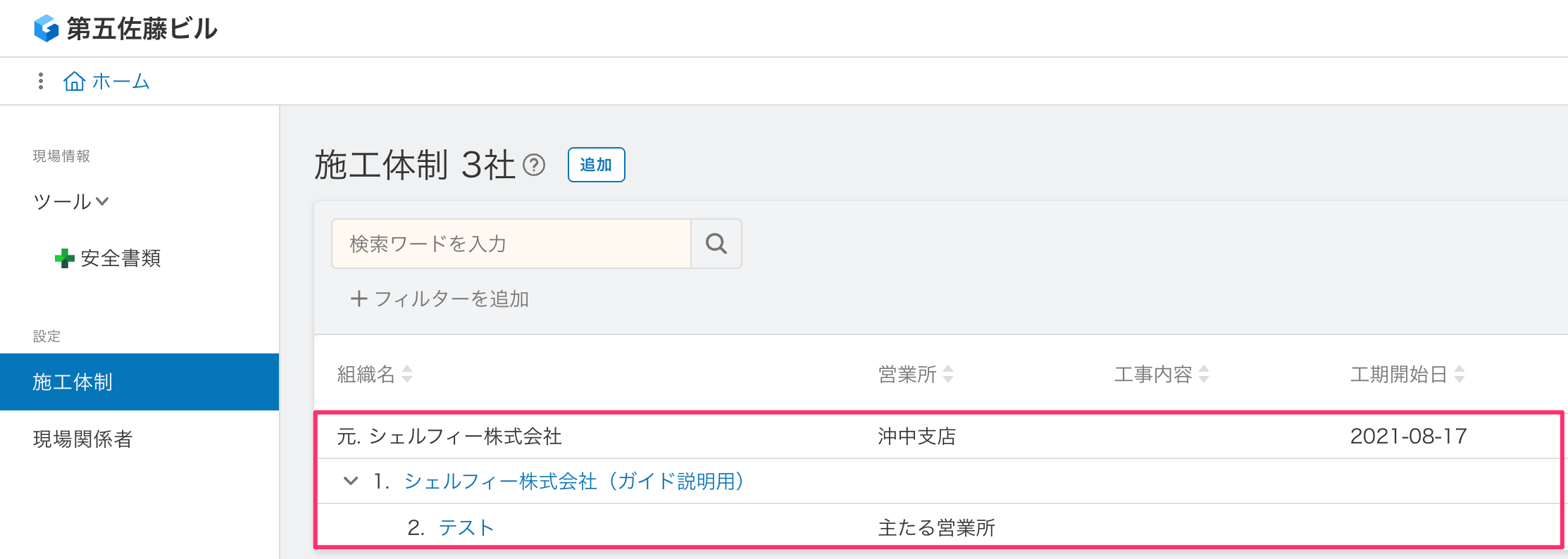 下請負業者編成表を見ると、[会社名][次数][工事内容][工期]が反映されています。