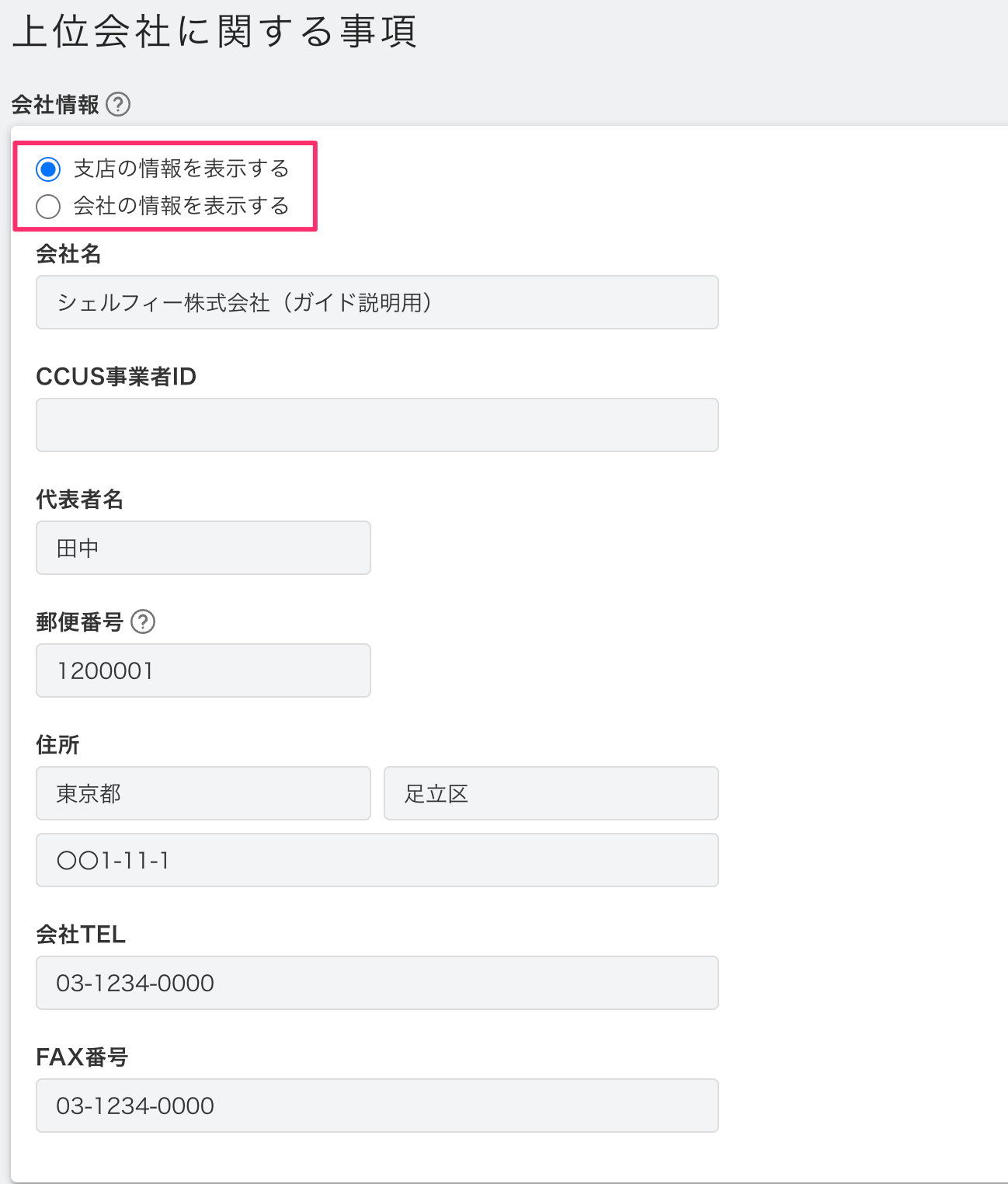 また、再下請負通知書では[会社情報][支店情報]の表示を変更することができます。