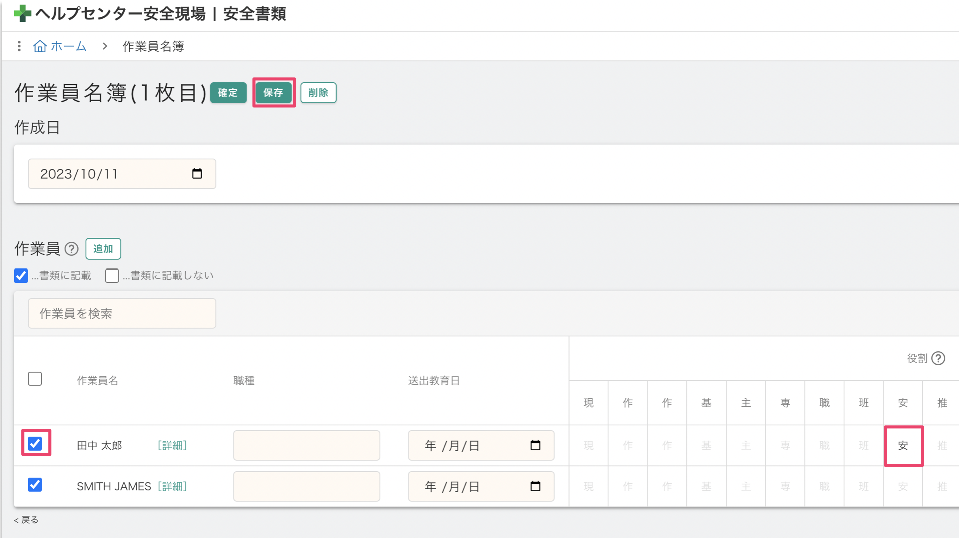 3.{従業員名}にチェック>役割の[安]をクリック>[保存]をクリック