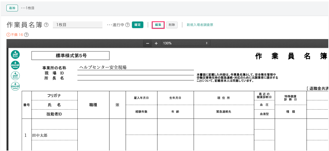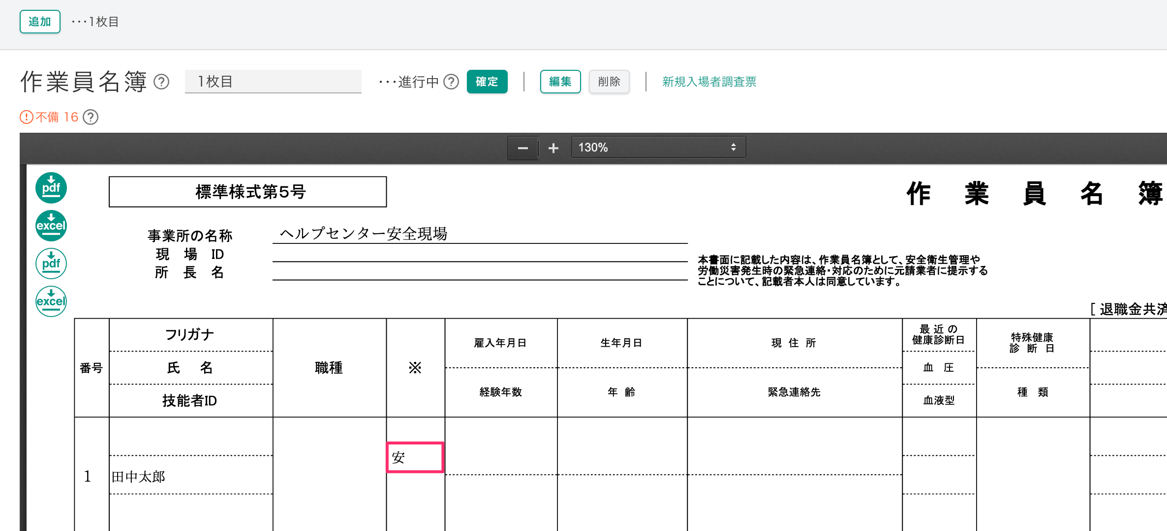 作業員名簿のプレビュー画面では、以下のように表示されます。