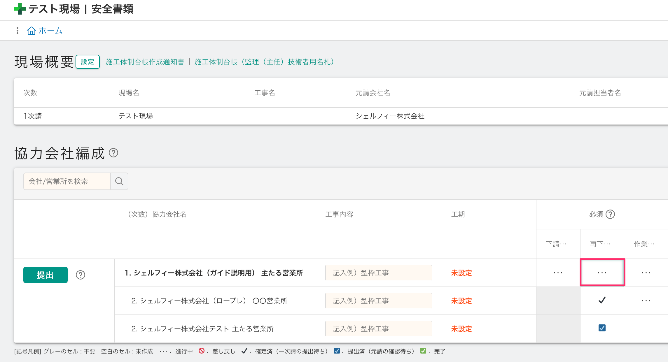 A.協力会社が複数社ある場合の再下請負通知書など、安全書類が複数枚あると、最も進行度が低いステータスが表示されます。
