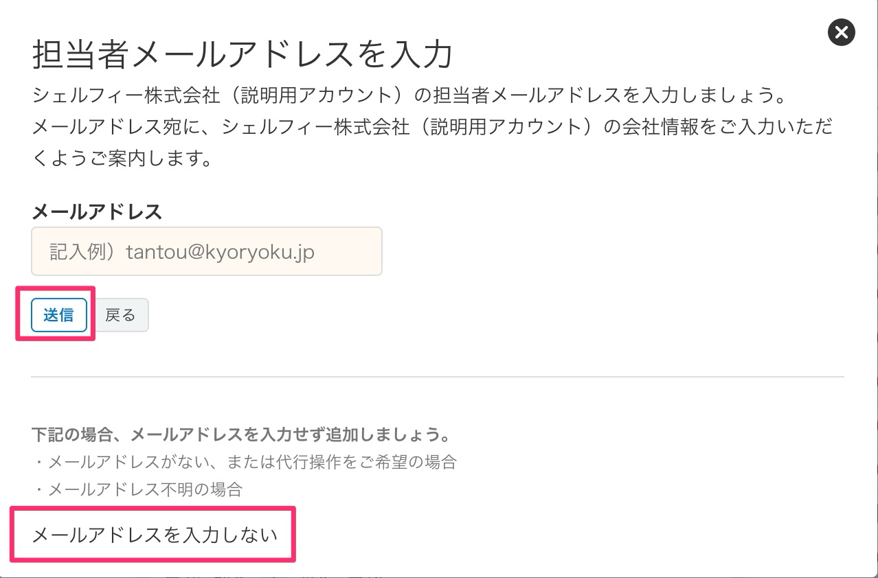 ※以前同じ担当者を招待しており、すでに会社情報を入力している、もしくは担当者のメールアドレスが分からない場合は[メールアドレスを入力しない]をクリックします。
