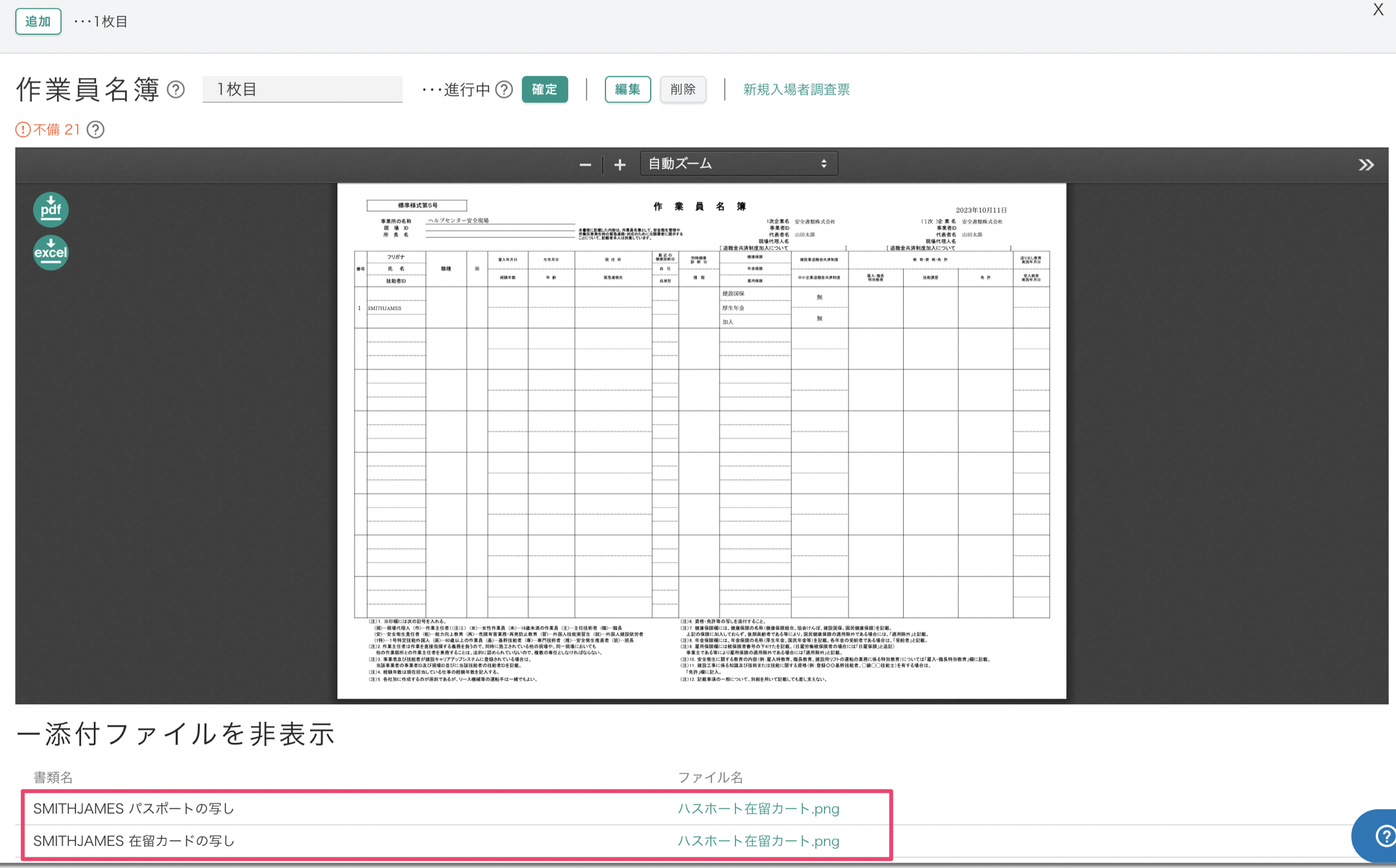作業員名簿のプレビュー画面下部に、従業員情報へ添付されているファイル名の一覧が表示されます。