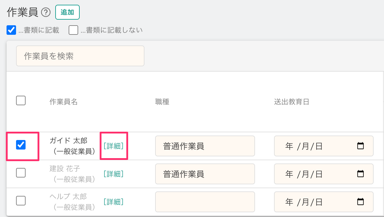 チェックが付いている従業員のみ、作業員名簿に記載されます。