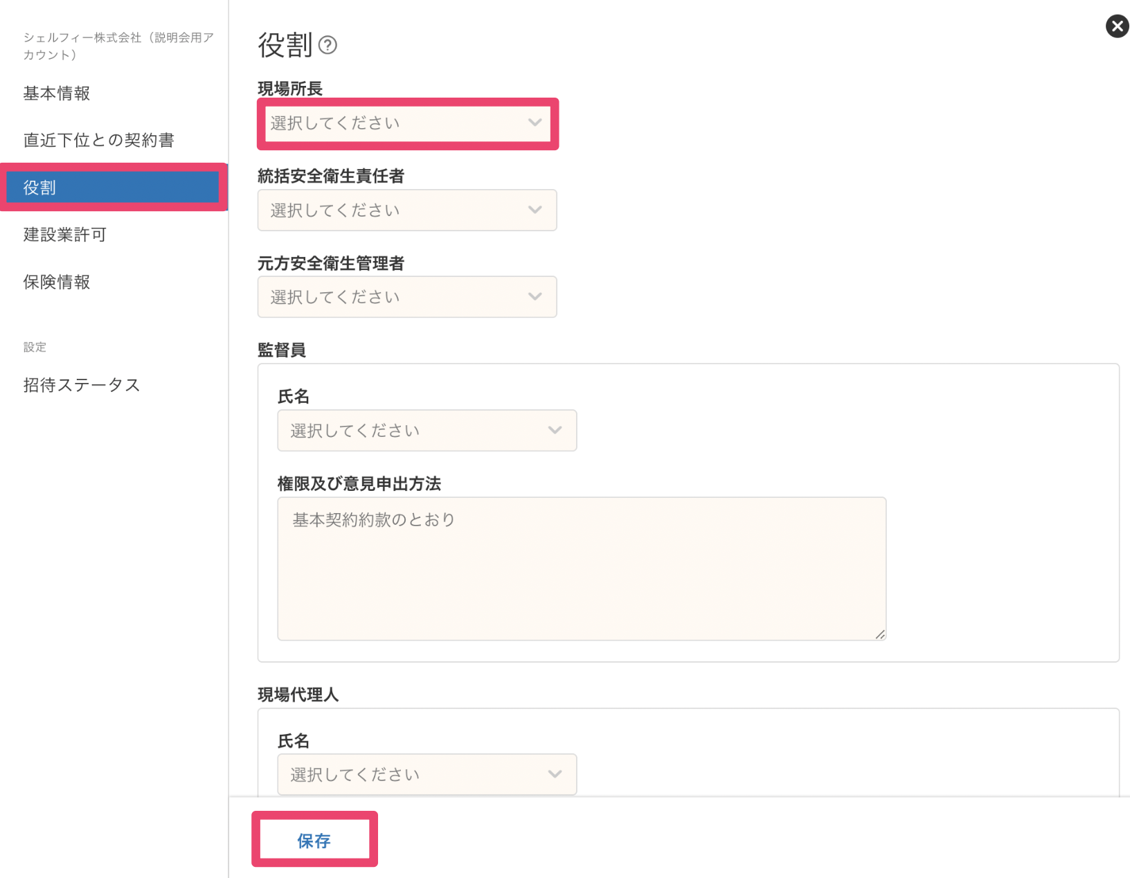 2. [役割]を選択し[現場代理人]を設定後[保存]をクリック