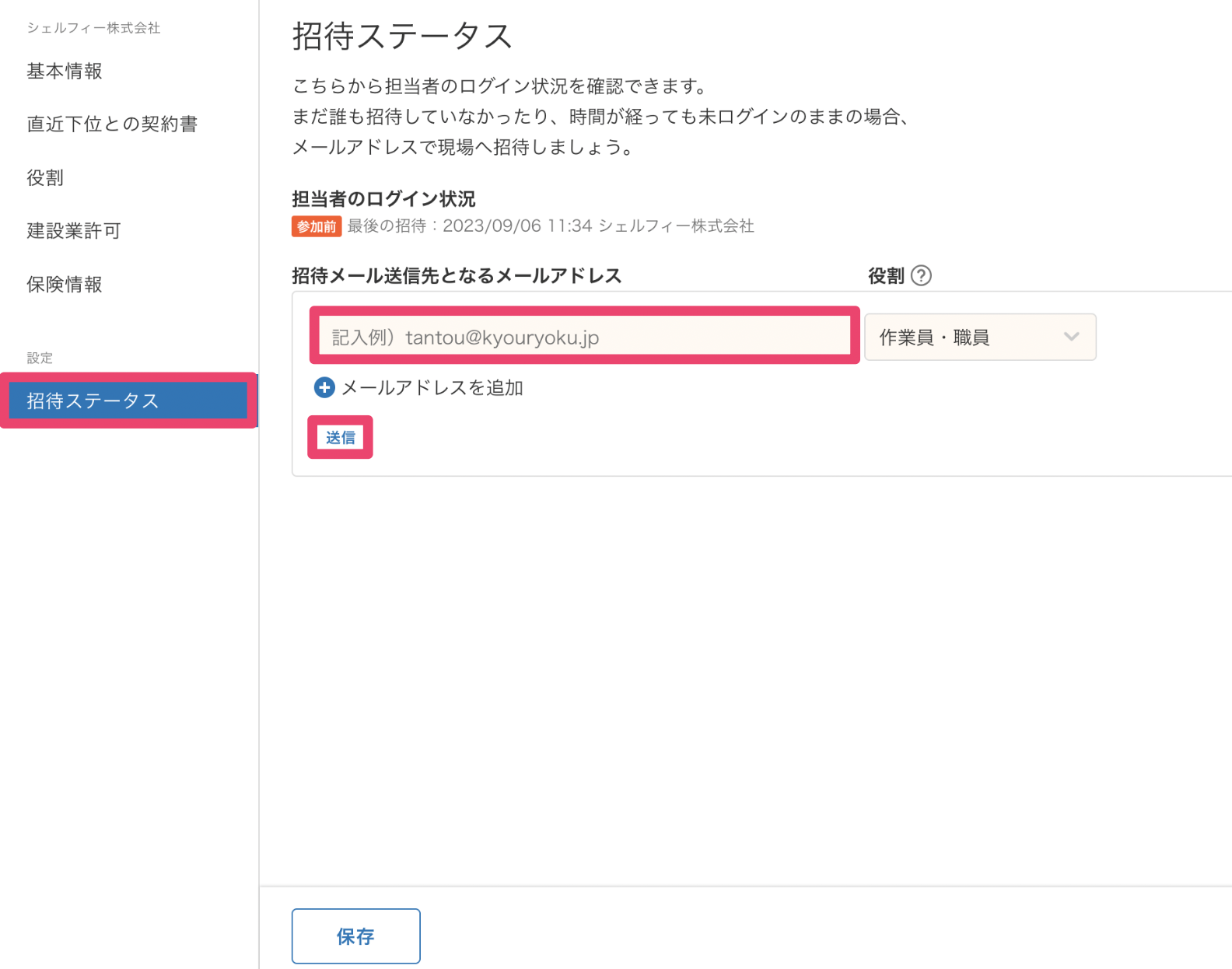 招待したい協力会社の中で組織権限が[管理者]となっている方がわかる