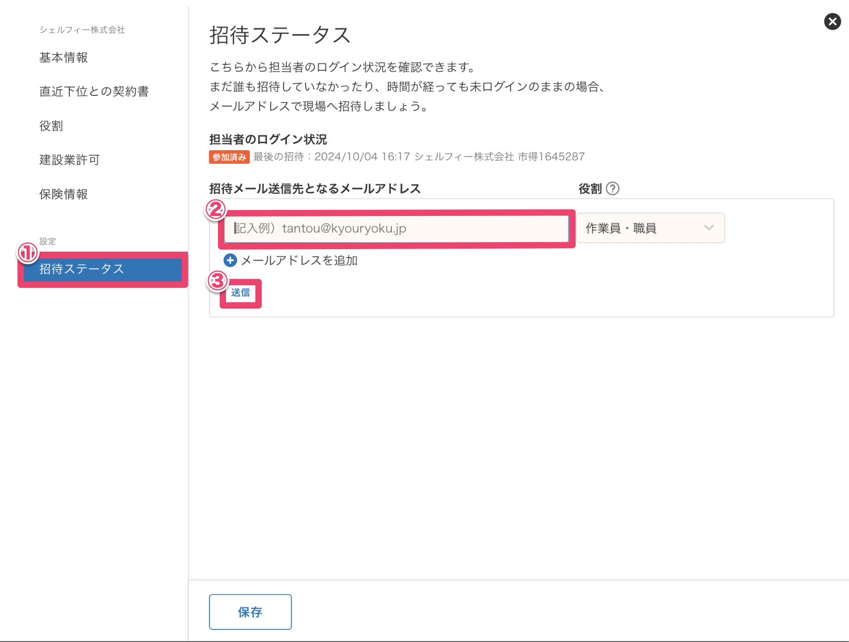 現場関係者からは、施工体制内の[招待ステータス]から招待をお願いします。